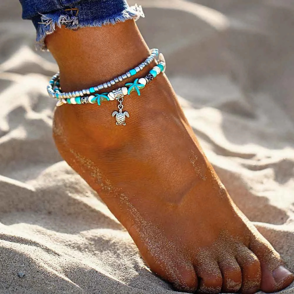 Turquoise stones, silver beads and carved shells bring beachy vibes to this Layered Turtle and Starfish Anklet! A playful turtle charm dangles from its centre, adding a little something extra to this ocean-themed Starfish Anklet set.