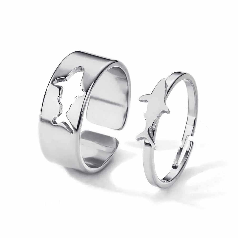 Discover our Matching Shark Rings – crafted from durable stainless steel. This set includes two rings, one with a striking shark cutout on a wide band, symbolizing strength, and the other featuring a sleek shark outline on a thin band, representing grace. Perfect for couples or stacked wear, these rings embody unity and style. Make a statement with these symbols of enduring love and adventure.
