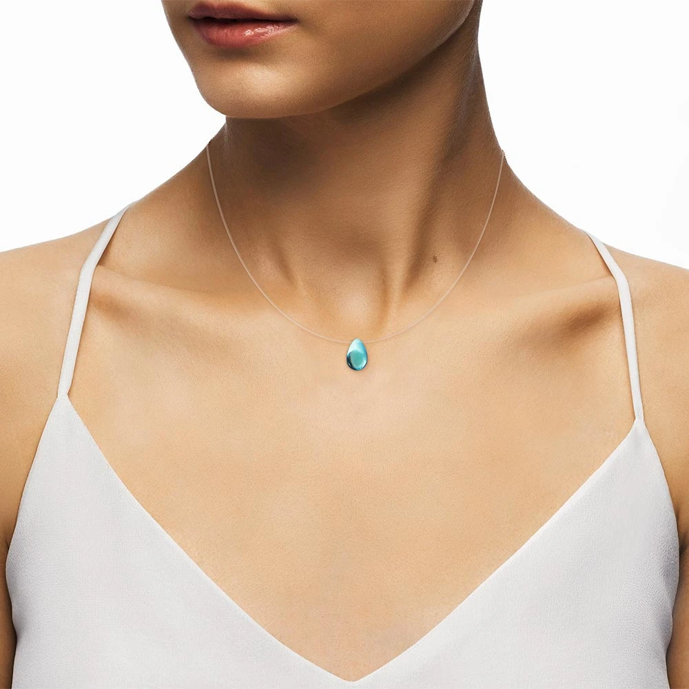 She came from the ocean and water is her life. Embrace your inner goddess with our elegant Mermaid Tear Necklace. The transparent iridescent blue pendant captures the essence of the ocean, reflecting mesmerizing hues as it catches the light. Suspended on an almost invisible fishing line, the tear necklace appears to float gracefully between your collarbones, creating a magical and enchanting look.