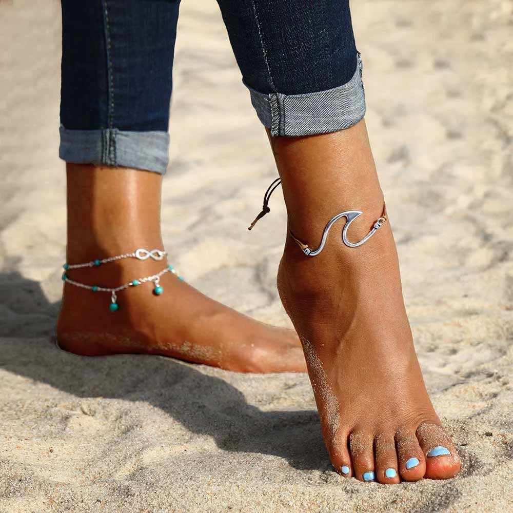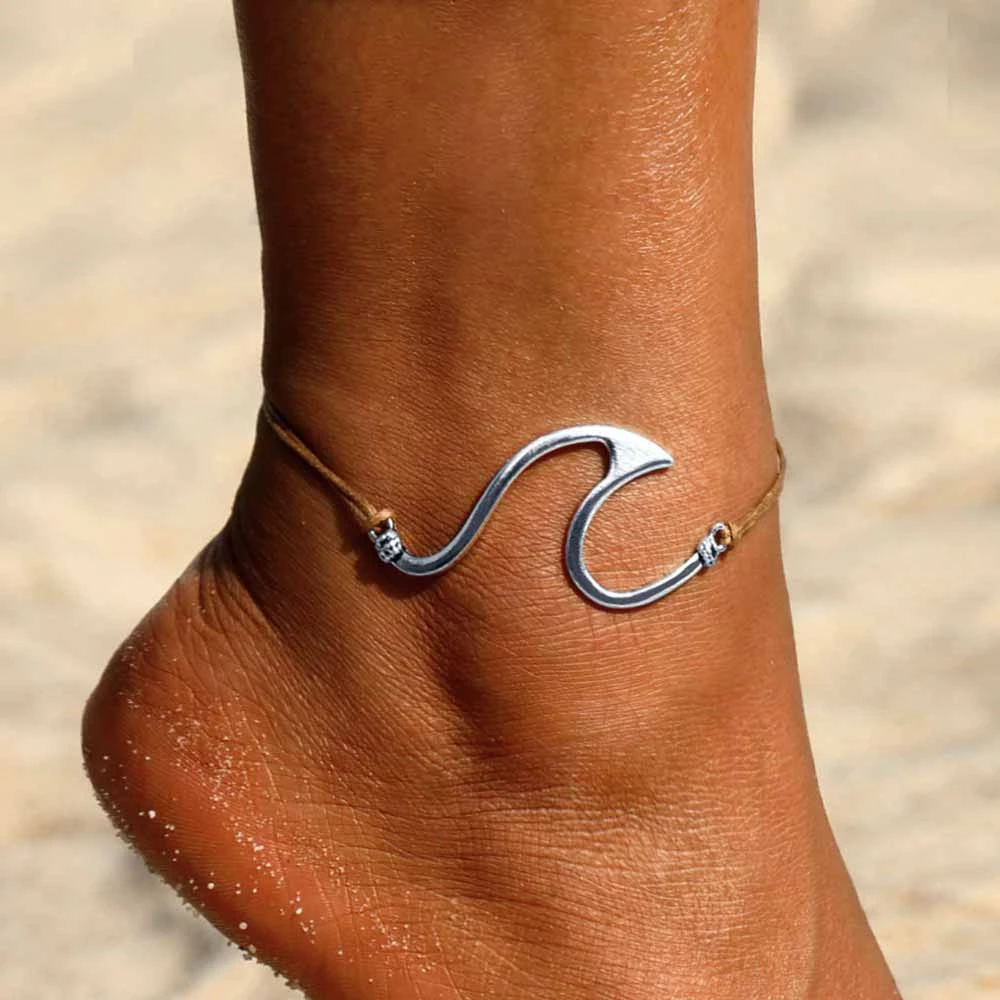 Enjoy high tides and good vibes in our edgy Ocean Wave Anklet! A silver wave is suspended on a simple brown cord, showcasing this striking design. Our Wave Anklet on Cord is a great gift for surf lovers & board babes.
