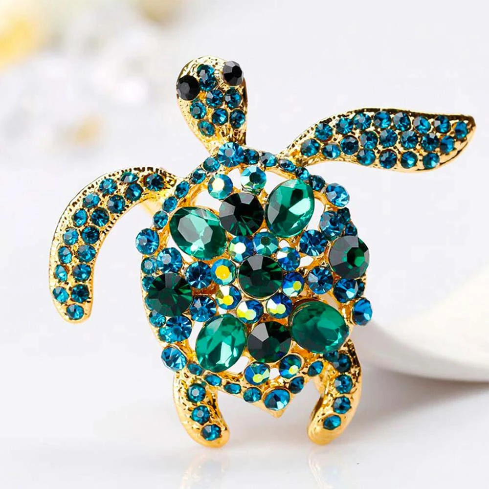 Make a statement on your jacket or dress and show off your love for turtles with this Rhinestone Turtle Brooch. Symbolizing good health and long life, our sparkling sea turtle brooch is silver plated with blue and green high quality Rhinestones.