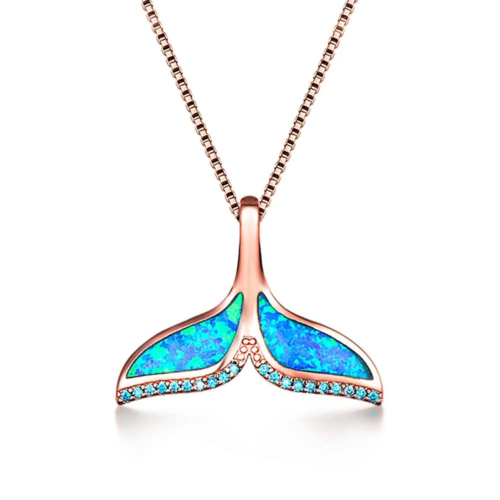 Make a stylish statement with our elegant Rose Gold Mermaid Fin Necklace. Crafted from 18K rose gold-filled metal, this necklace features a stunning mermaid fin pendant adorned with blue opal accents at the center of each fin. The fin is beautifully embellished with high-quality cubic zirconia, adding a touch of sparkle. The pendant hangs from a matching box link chain, creating a modern and feminine look that showcases your love for the ocean.